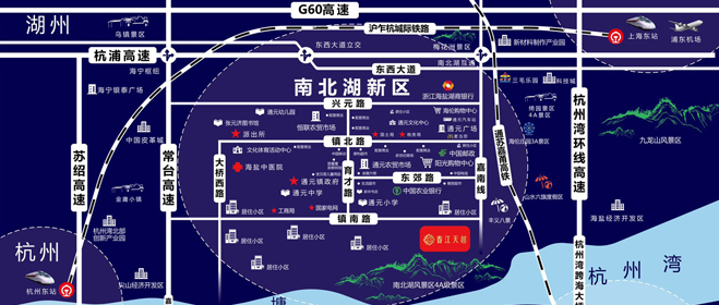 项目距离市中心130公里左右,从杭州过来车程80公里,1个小时即可到达,到苏州、宁波都在2个小时左右内,未来2条城际高铁和1条轻轨,两条高铁为南北走向的沪嘉甬跨海铁路,东西走向的沪乍杭铁路,以及一条轻轨直达嘉兴南站高铁。因为我们地处沪苏杭甬几何中心,居住在我们这里享受南北湖美景同时,可以做到说走就走。环杭州湾区发展有自身的特点,杭州湾南岸已经形成密集型汽车制造业,杭州湾北部也就是我们项目所处区域,以生态旅游为产业支撑,G15沈海高速可称为绿色走廊,将浙北地区的各个景区有机串联起来。